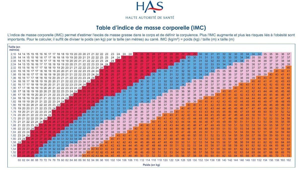 Le tableau de la HAS ci-dessous vous permettra de connaître l'IMC facilement